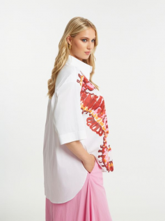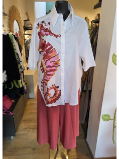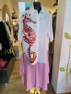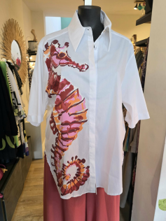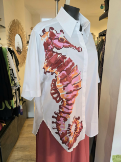 Superbe chemise oversize avec un hippocampe. Les couleurs sont vraiment chouettes et très actuelles. On peut évidemment la porter avec un jeans, un pantalon en lin, etc... En 79% coton, 18% polyamide et 3% élasthanne. Hauteur devant 77 cm et 82 au dos.