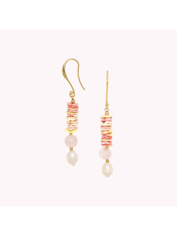 Petites boucles raffinées de la série Spiaggia Rosa. Coquillage, nacre et perle de culture. Crochet en laiton.