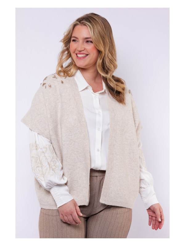 Très beau gilet à porter sur tout avec des brillants incrustés aux épaules. En 65% polyester, 13% acrylique, 13% polyamide, 6% laine et 3% élasthanne. Hauteur : 67 cm. Super aussi sur une robe.