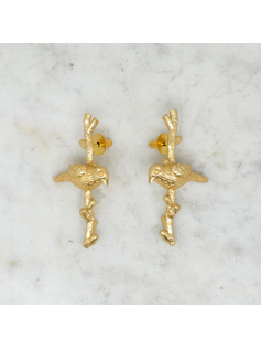 Boucles d’oreilles en laiton doré à l’or fin. Le design met en scène un oiseau délicatement sculpté, posé sur une branche aux formes organiques et texturées. Hauteur : 5.1 cm.