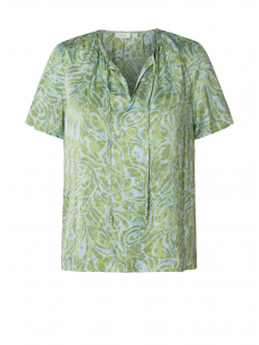 Blouse satinée et lisse comme de la soie en 100% viscose. Avec col ouvert et petit lien à nouer. Hauteur environ 74 cm.