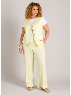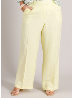 Pantalon large en 55% lin et 45% viscose. Forme pantalon de costume large avec taille haute braguette et fermeture par grosse agrafe. A porter en tailleur complet avec le blazer ou le gilet assorti. Entrejambe environ 80 cm.