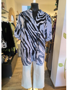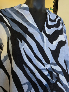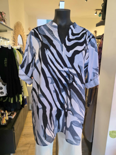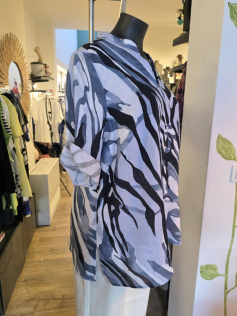 Longue tunique en lin très chic dans un beau chamarré bleu. A porter sur un jeans bleu ou blanc mais aussi sur un pantalon en lin blanc par exemple. Hauteur environ 76 cm.