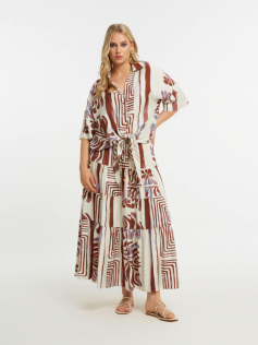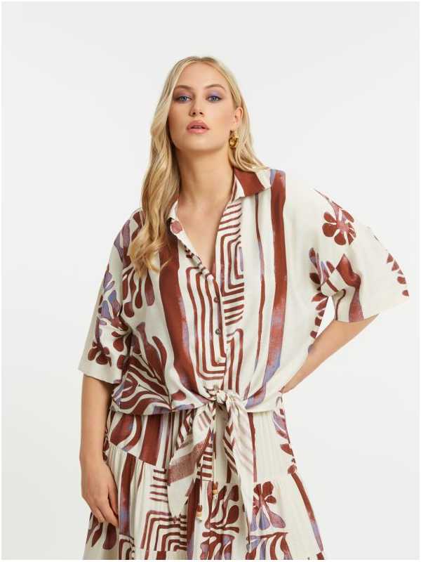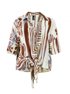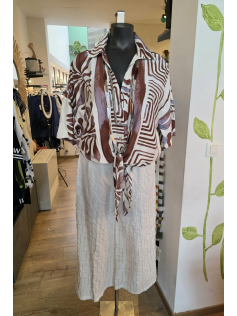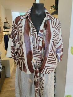 Très jolie chemise en 85% viscose et 15% polyester. imprimé et coloris super tendance. A porter avec la jupe assortie ou de l'uni. A nouer dans le bas. Hauteur environ 75 cm.