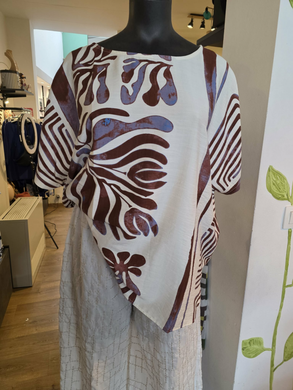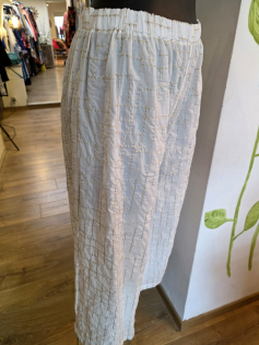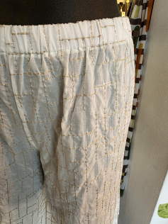 Pantacourt large en 100% coton écru brodé en beige. Il taille bien large et convient aussi aux cuisses plus fortes. Le tissu texturé cache les imperfections et c'est tant mieux. Taille élastiquée. Entrejambe : 65 cm.