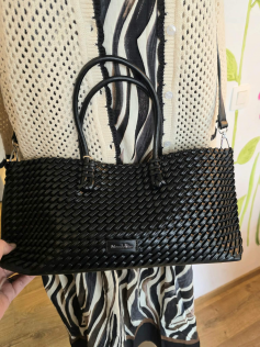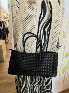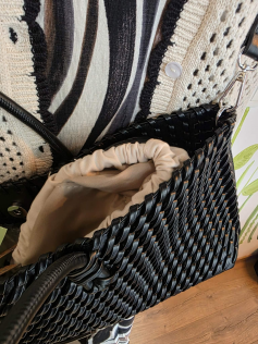Forme super tendance pour ce sac tressé en eco cuir noir. Longueur 44 cm et hauteur 22 cm. Se ferme par pression. Grande tousse à l'intérieur.