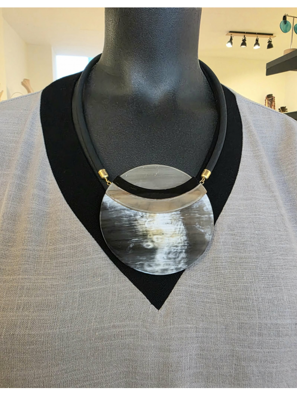 Grand collier avec tour en cautchouc et un grand médaillon en corne. Le collier est très large et conviendra aux cous les plus forts sans problème.