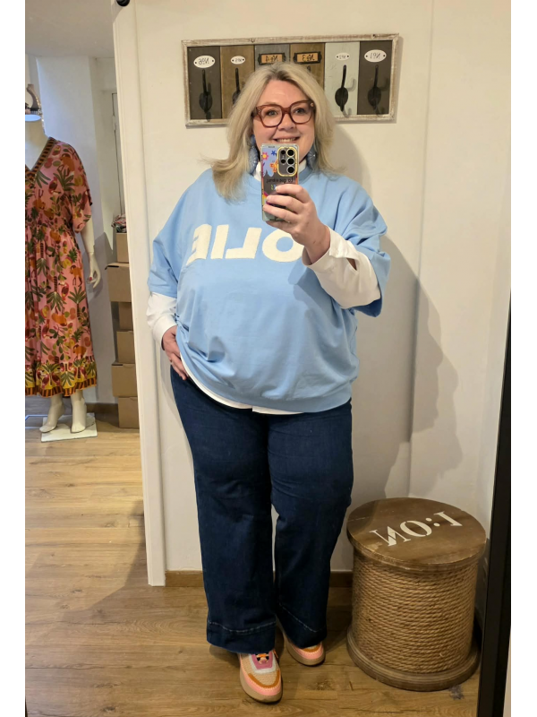 Trop beau ce sweat tout doux dedans avec des manches un peu courtes et l'inscription jolie sur le devant. Forme oversize. En 100% coton