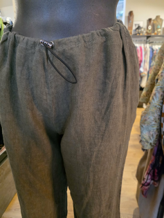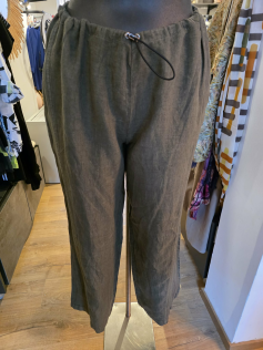 Pantalon en lin kaki de très belle qualité. Forme droite pas trop large mais pas super étroit non plus. C'est un modèle qui va vraiment bien. Taille élastiquée à resserrer avec un lien. Entrejambe environ 50 cm. A porter facilement, le kaki s'accorde avec beaucoup de couleurs. Mais aussi avec la chemise assortie.