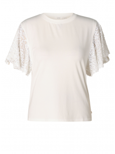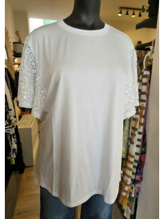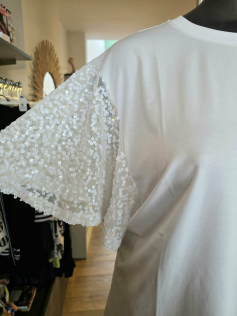 Très joli tee-shirt blanc dont on a toujours besoin mais celui-ci a de magnifiques manches volantées à brillants. Adorable. En 45% coton, 45% viscose et 5% élasthanne. Hauteur : 72 cm.