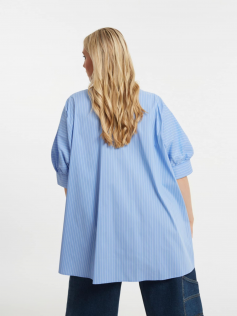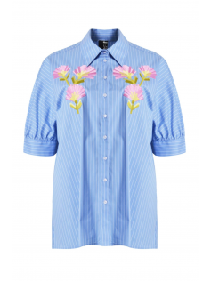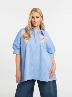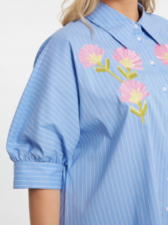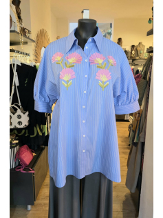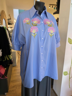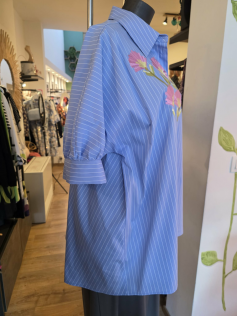 Magnifique chemise oversize lignée et brodée très soigneusement sur le haut. Elle est en taille unique et conviendra à toutes, à condition d'aimer les choses un peu larges. Elle ne se chiffonne pas. En 72% coton, 25% polyamide et 3% élasthanne. Hauteur environ 80 cm au dos et 75 devant. Une beauté !