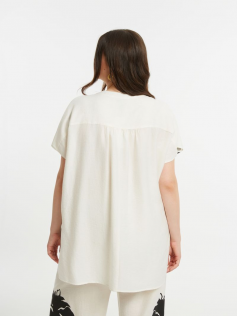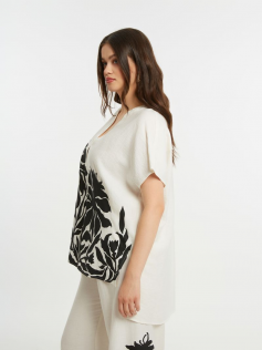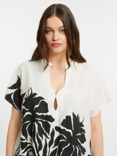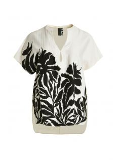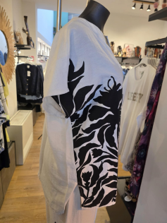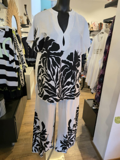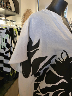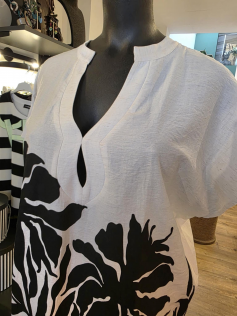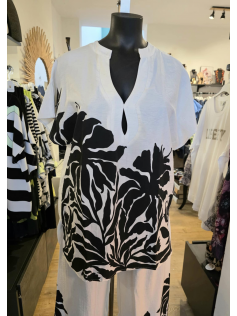 Très belle blouse en noir et blanc avec une goutte sur le devant à porter sur un pantalon uni mais aussi avec le pantalon assorti pour un look plus habillé. Elle est dans un très beau tissu mélangé : 66% viscose, 22% polyamide et 12% lin. Hauteur environ 69 cm.