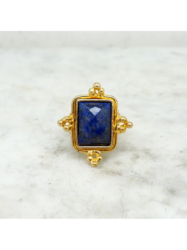 Bague carrée en laiton dorée à l'or fin 18 carats. Elle s'ajuste parfaitement à votre doigts. Le tour est bien large il ne pince pas, il ne fait pas mal. Elle est sertie de lapis-lazuli.