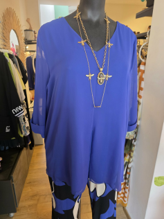 Blouse de très belle qualité en voile de polyester doublée sur tout le corps en jersey de viscose extensible pour le confort. Manches 3/4 en voile non doubliées. Hauteur environ 72 cm.