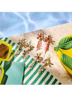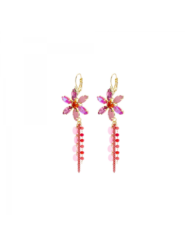 Dormeuses en métal doré sans nickel avec une petite fleur en verre et des petits pendants. Longues mais pas trop voyantes. Hauteur : 6.5 cm