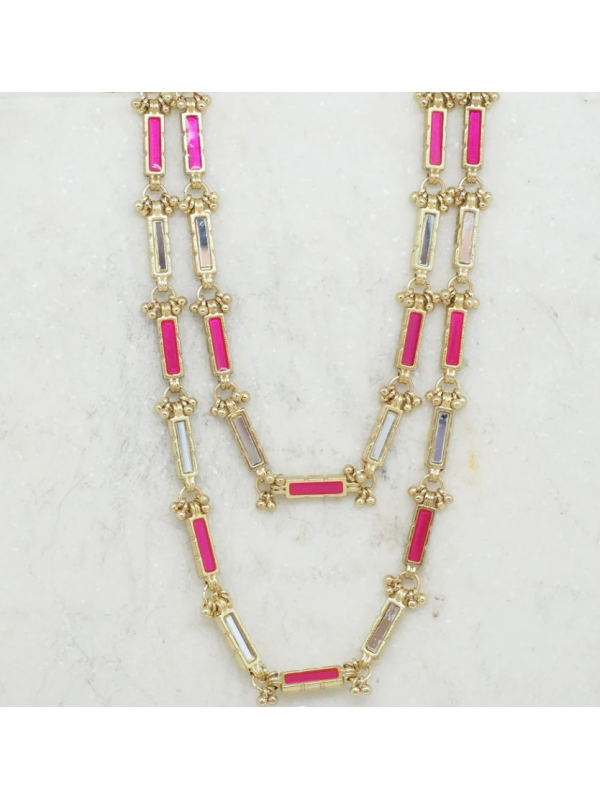 Très long sautoir en laiton doré à l'or fin avec des rectangles en émaux miroir et fuchsia. Il est super long on peut facilement le superposer.
