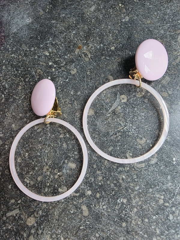 Grandes boucles ultra light en acétate de cellulose. Rose très pâle. Elles sont clips. Hauteur environ 8 cm.