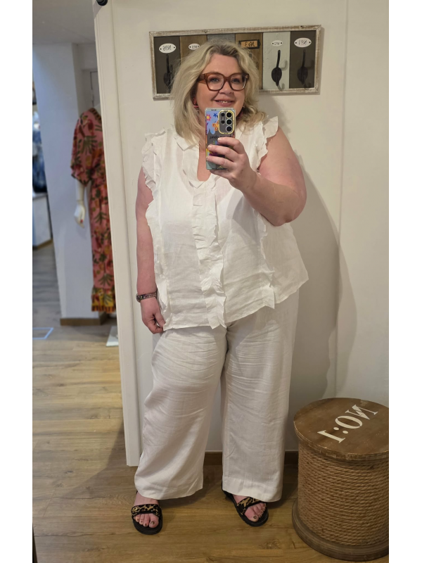 Adorable blouse blanche avec petits volants. En 100% lin. Hauteur : 72 cm