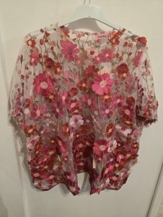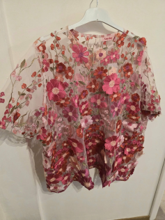 Blouse en tulle avec des fleurs brodées partout dans le tissu. Une petite merveille, on dirait de la haute couture. Elle est transparante donc je vous conseille de la porter avec un top blanc ou même un rose. Hauteur environ 72 cm. Elle se ferme au dos avec un petit bouton.