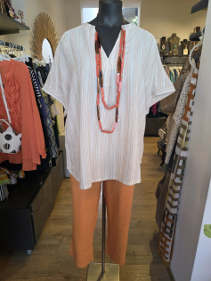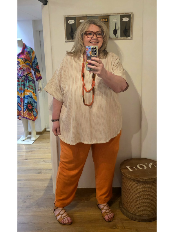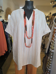 Blouse style liquette à enfiler dans un beau tissu brodé de lignes orangées. En 85% viscose et 15% lin. Hauteur : 73 cm.